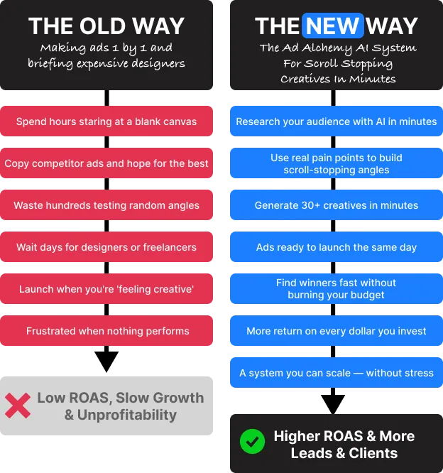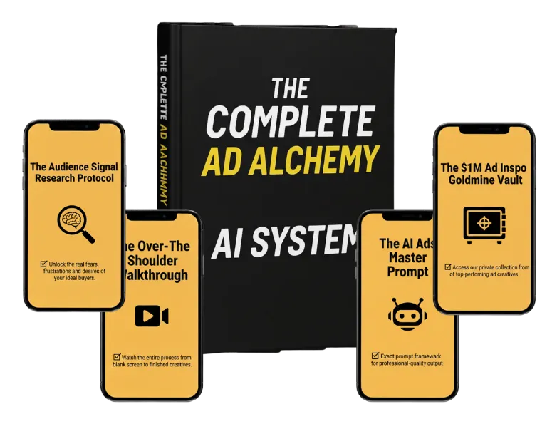 You're getting the complete Ad Alchemy AI System — instant access to The Signal Protocol research framework, the full AI creative engine process, our master prompt, an over-the-shoulder video walkthrough, and the Goldmine Vault swipe file of top-performing seed creatives. Everything you need to generate 100+ ad creatives in minutes.
